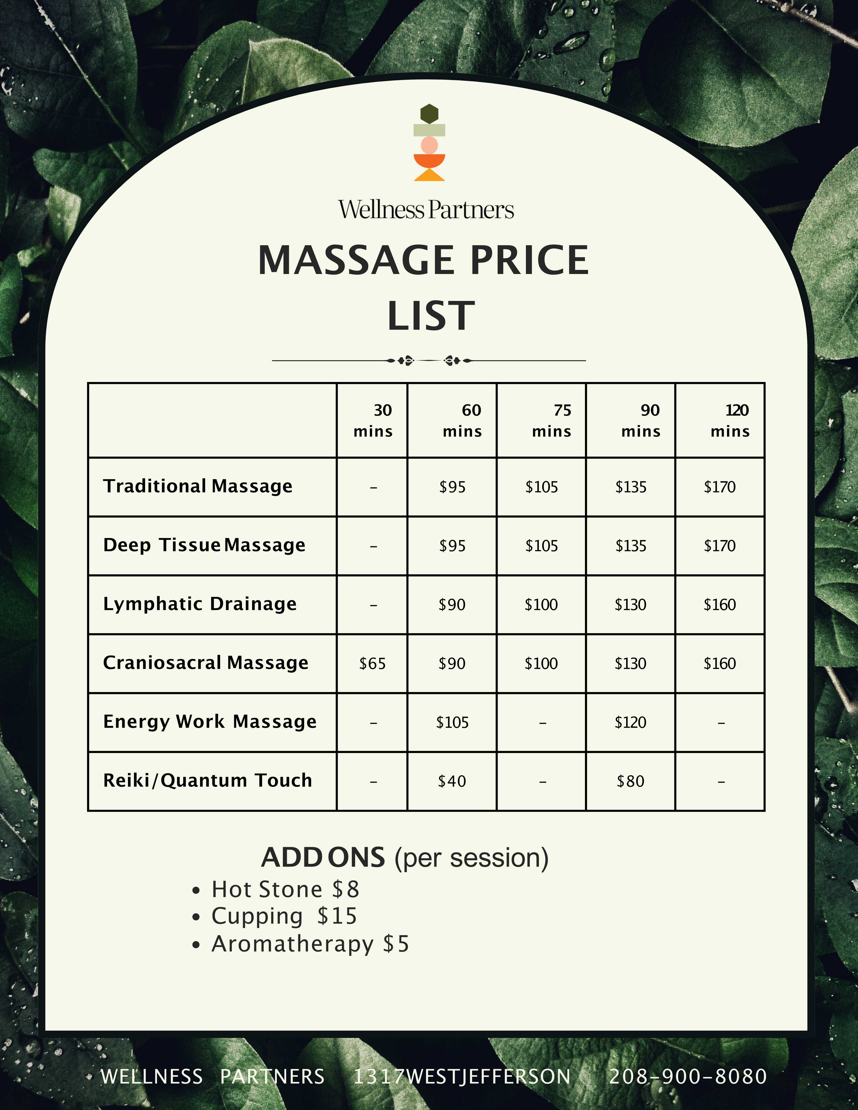 The physical and psychological benefits of massage are well documented in scientific literature. Prioritizing your health in the form of a massage, with its minimal risk and numerous benefits, is a superior compliment to your overall wellness practice. Whether you routinely receive massages or are new to this form of healing and relaxation, our massage therapist will work with you to determine the type of massage that is right for you.